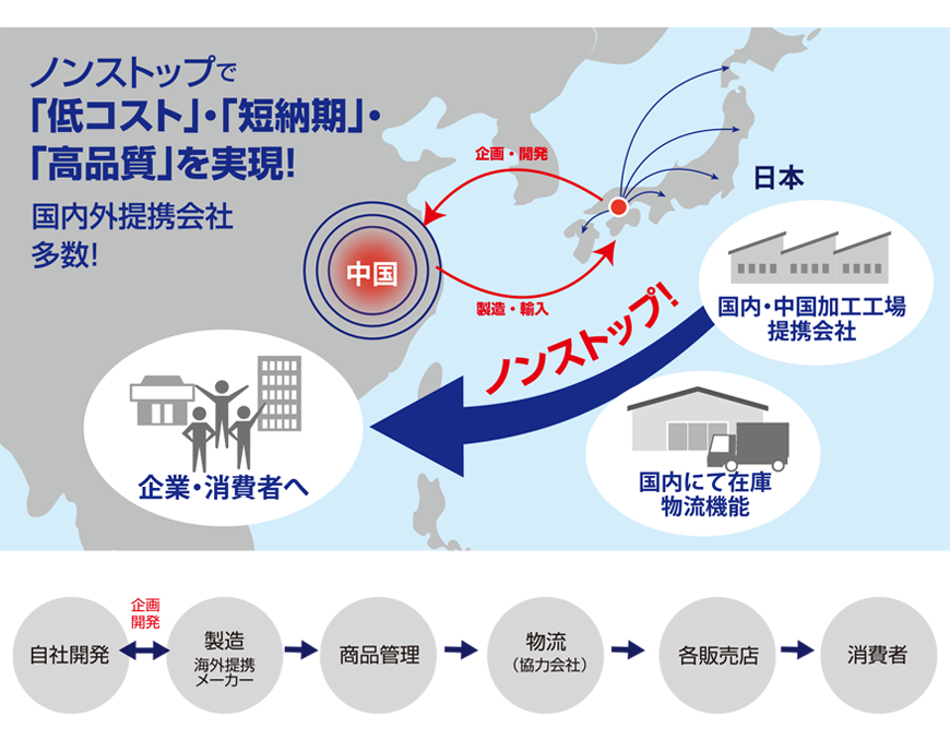 自社で企画開発したものを、国内外の提携メーカーで製造、物流に至るまでワンストップで企画提案で致します。